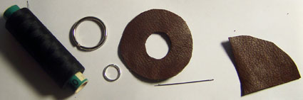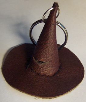 5. Du piekst im Falle Leder ein Loch in die Spitze des Hutes und fädelst den mit der Zange leicht aufgebogenen kleinen Anhängering oder das Kettchen durch den Hut. Dann biegst du den Anhängerring wieder zusammen. Im Falle Filz, solltest du die Hutspitze an den kleinen Ring oder an das Kettchen stabil - also mit vielen Schlingen - dran nähen.